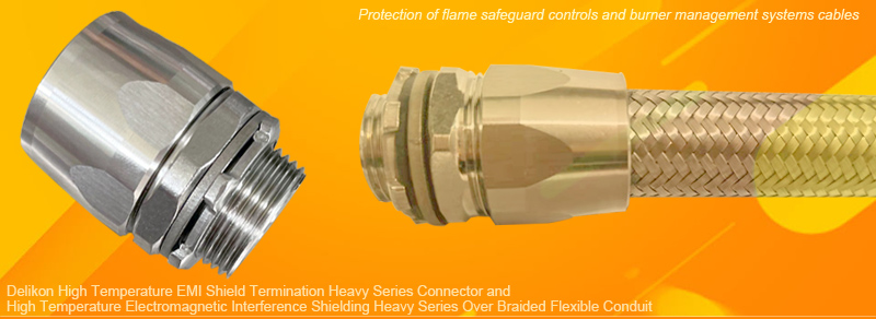Delikon High Temperature Heavy Series Stainless Steel Connector is ideal for foundry, automotive industry, glass manufacturing, steel mills and other high temperature processes wiring. Delikon High Temperature Heavy Series Over Braided Flexible Metal Conduit and Connector offer mechanical protection as well as protection against hot sparks, slag and electromagnetic interference. High Temperature Heavy Series Stainless Steel Connector |